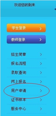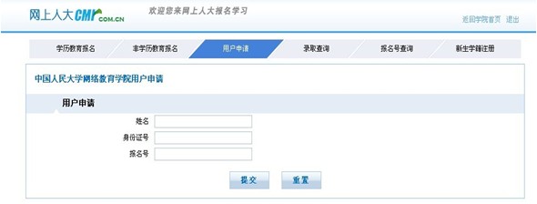 报名号查询到后,点击用户申请,输入本人真实姓名和身份证号、报名号后点击提交。