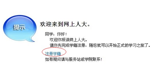新生学费到账后,就可进行学籍注册,登录网上人大主页www.commonapex.com右侧学生登录,输入用户名和密码、验证码,登录后看到如下图,点击注册学籍。