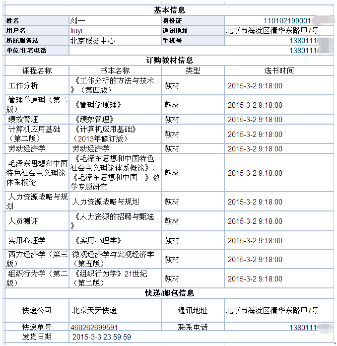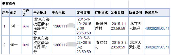 3、目前, 2015年1月—3月期间选课选教材、2015年1月到4月13日期间直接订购选教材的快递单号已全部可以查询。如下特殊情况的学生不可以查询: