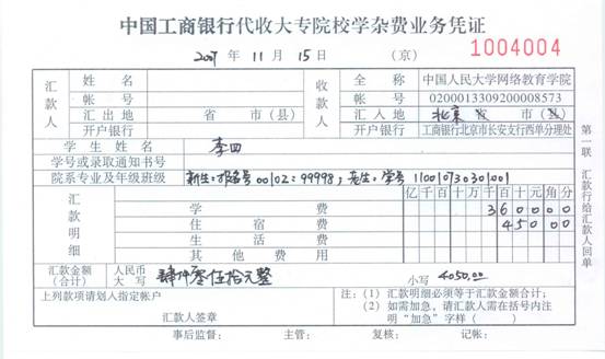 注2:根据中国工商银行的规定,异地代收学费金额在1万元以下者,须交5.5元的手续费,手续费由学生缴纳。北京同城代收学费不需缴纳手续费。