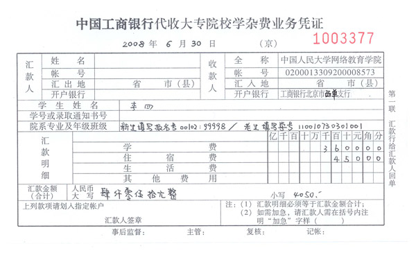 学生填写《中国工商银行代收大专院校学杂费业务凭证》时,除银行要求的其它必填项外,还须按照如下要求完整无误填写《中国工商银行代收大专院校学杂费业务凭证》上的以下项目,方可使汇款安全、准确地得到网上人大的财务确认(填写样本见第二页):